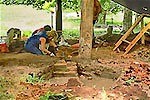 Much of the site focuses on the on-going excavations of the plantation's slave and tenant cabins. Artifacts unearthed at the location of four particular cabins suggest that the residents of these dwellings had distinct roles: blacksmith, political leader, curer/conjurer, and shell and bone carver. Several of the objects provide evidence of African traditions. A carving from the curer's cabin matches the Kongo sign of cosmos, and the fly whisk uncovered at the political leader's residence resembles symbols of authority traditionally found in West Africa.