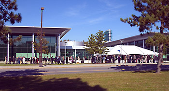 in front of the new building, the facility is