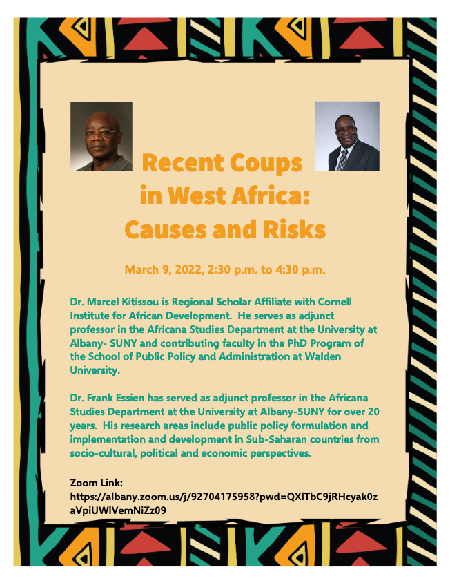 On March 9, 2022, from 2:30 to 4:30 PM, Drs. Marcel Kitissou and Frank Essien of UAlbany's Department of Africana Studies will be presenting about recent political coups in West Africa. Their discussion, entitled, "Recent Coups in West Africa: Causes and Risks," will be held over Zoom, and is open to the UAlbany community. You can join via the Zoom link below: