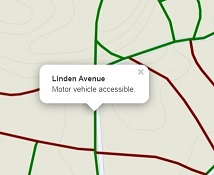 The roads layer differentiates travel by motor vehicle (green) or pedestrians where motor vehicles are prohibited (maroon). Clicking on any road affirms its travel status. Clicking on a motor vehicle road also provides its name.
