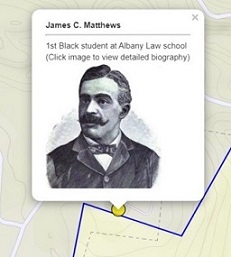 Clicking any point from a tour theme, returns a popup displaying the individuals name, a portrait if available, and highlights one of their life accomplishments. Clicking on the popups image, irrespective of it being a portrait or default “No Image”, returns a biography of their life including text, pictures or other media.