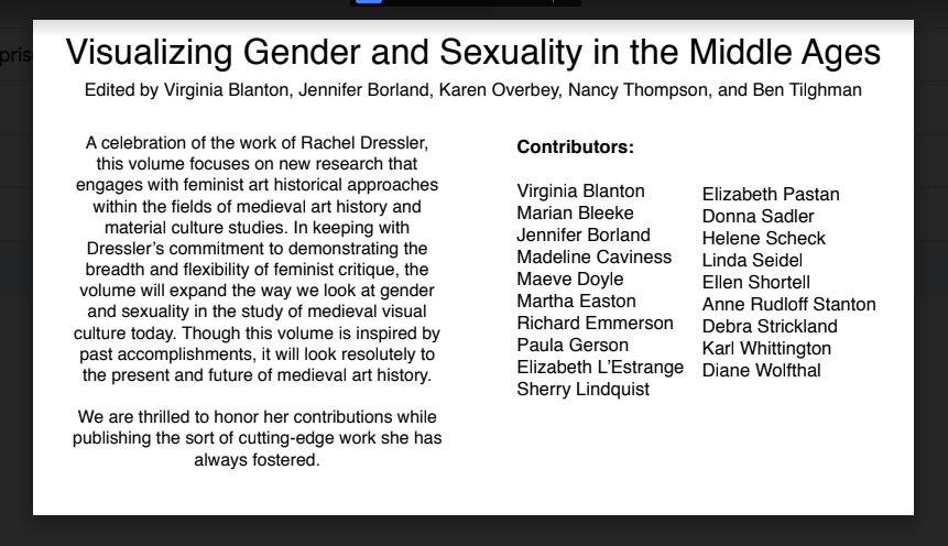 Visualizing Gender and Sexuality in the Middle Ages is a planned volume in celebration of the work of Rachel Dressler, associate professor of art history at the University at Albany, and focuses on new research that engages with feminist art historical approaches within the fields of medieval art history and material culture studies. Contributors and more details found below.