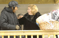 Christine Bouchard, associate vice president for Student Success, presents a basket of blankets to new Habitat for Humanity homeowner Nicole Brunson. The blankets were made by UAlbany students as a housewarming gift for Brunson and her two children. (Photo by Mark Schmidt.) |