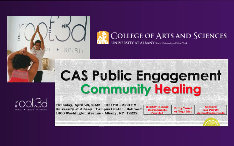 Join CAS Public Engagement for community healing with Yoga and Meditation with Root3D on Thursday, April 28, 1-2:30 p.m. in the Campus Center Ballroom. Bring a towel or yoga mat. Healthy, healing refreshments will be provided. Contact Deb Privott at [email protected].
