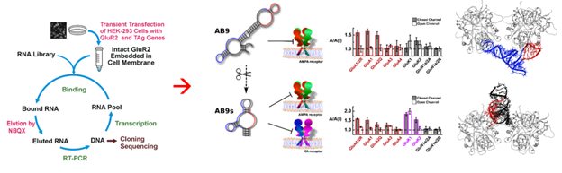 One of the core components in our research is the discovery of RNA molecules as water-soluble, potent and selective antagonists or positive modulators (potentiators) of glutamate ion channels. We use SELEX technique to isolate these useful aptamers from a large RNA library (about 1,014 sequences). We also make chemically modified RNA aptamers by replacing 2’-OH group in ribose so these RNA aptamers are long lasting and are therefore amenable for in vivo use as drug candidates for CNS diseases.
