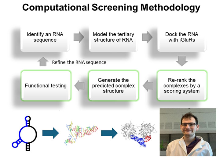 Computational modeling of RNA-glutamate receptor interactions has been a recent addition as a tool for our effort to develop RNA aptamers with high potency and selectivity. This method is especially useful when combined with RNA sequence mutations and then functional testing of the sequence variants with individual glutamate receptor channels using electrophysiology. The diagram below shows a flowchart of our approach.