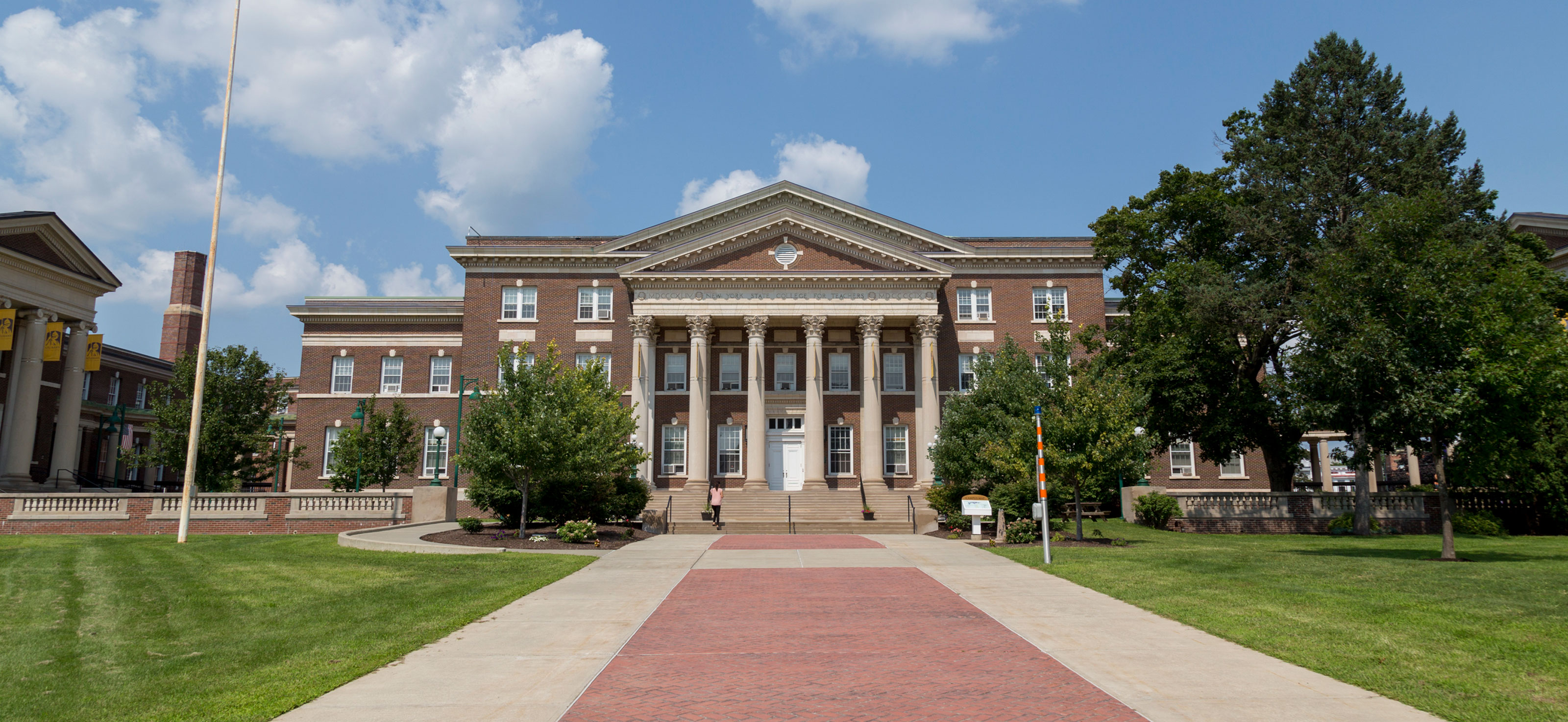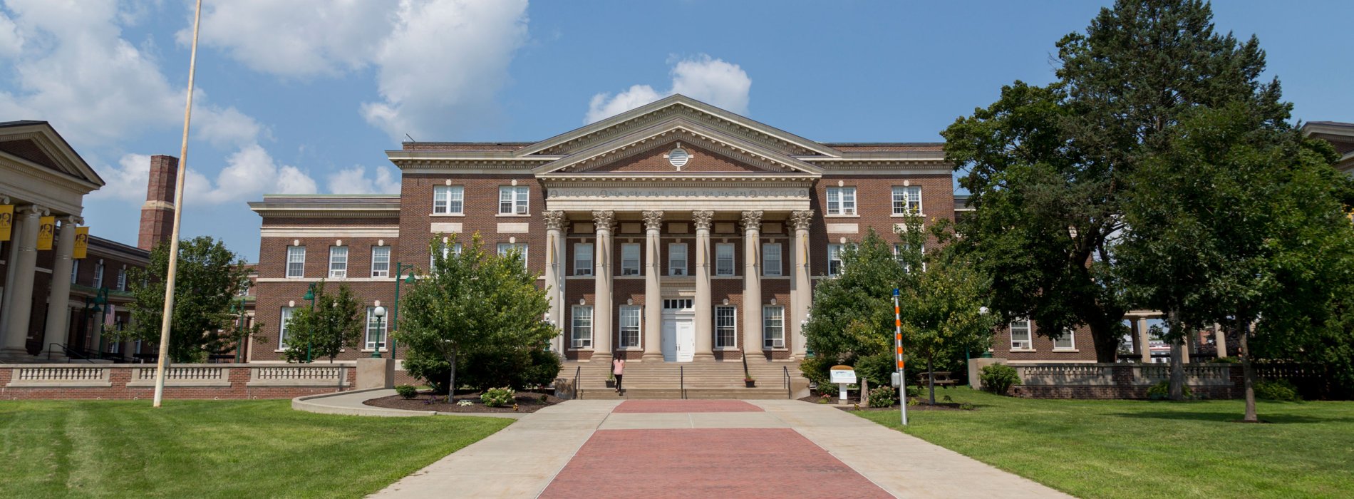 A brick Downtown Campus building with six tall columns and a brick walkway on a sunny day. A brick Downtown Campus building with six tall columns and a brick walkway on a sunny day.