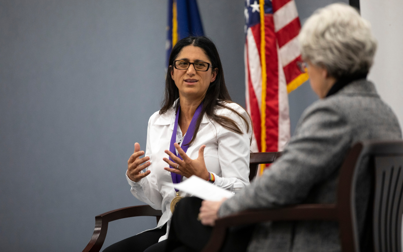 Members of Dr. David Axelrod’s family and former colleagues, students, faculty, alumni, public health professionals, non-profit organizations and community members gathered at the Health Sciences Campus for the Axelrod medal presentation and to hear Dr. Hanna-Attisha speak about her work. Through a “fireside chat” format, she answered questions posed by School of Public Health Interim Dean Mary Gallant on the Flint water crisis, speaking science to power, and environmental injustice and racism.