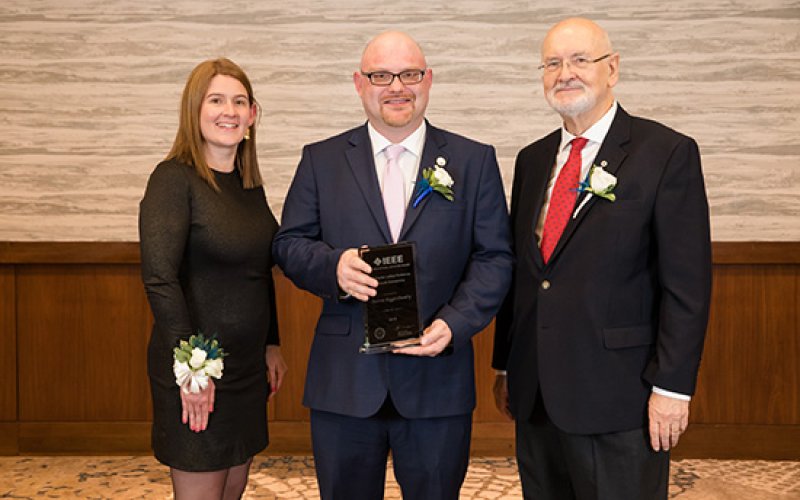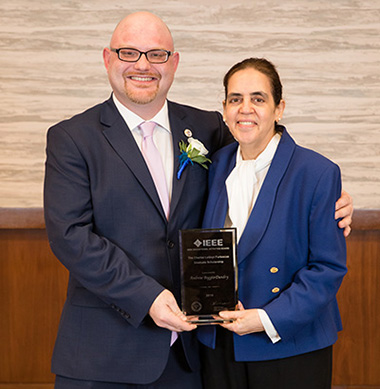 IEEE Vice President for Educational Activities Witold Kinsner and EAB Awards and Recognition Committee Chair Lorena Garcia present Andrew with his award