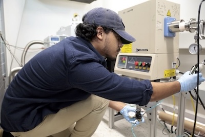 Kevin Reyes, a student researcher at the University at Albany, optimizes a tube furnace for copper deposition in an additive manufacturing project.