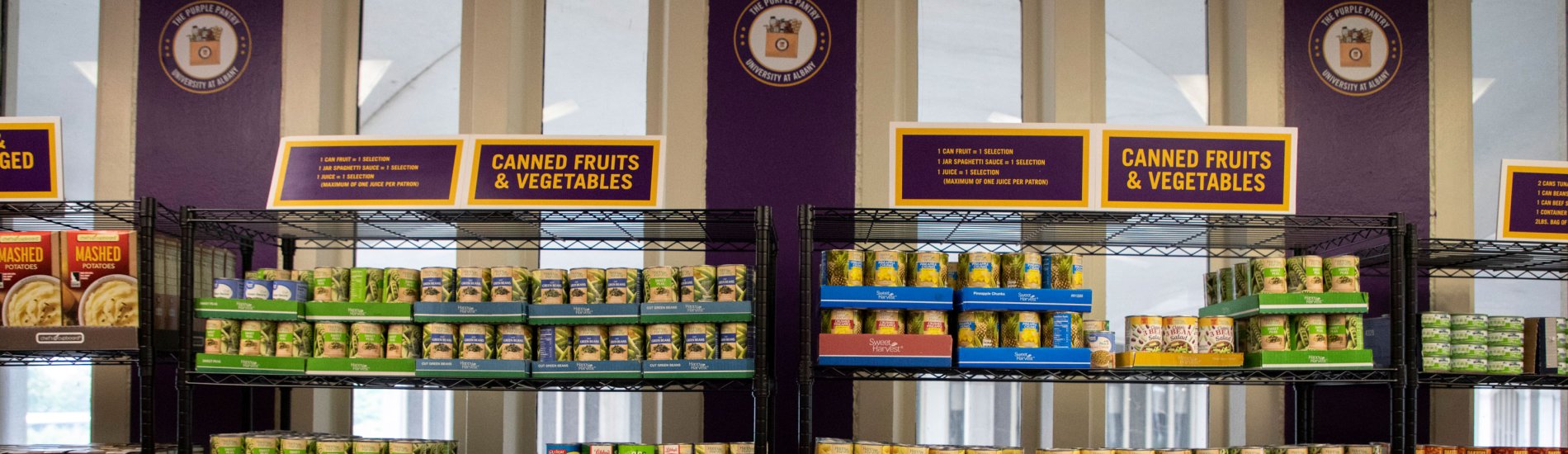 The Purple Pantry is stocked with a variety of non-perishable foods, frozen foods, fresh produce, personal items and toiletries. It is open to all current UAlbany students, faculty and staff.