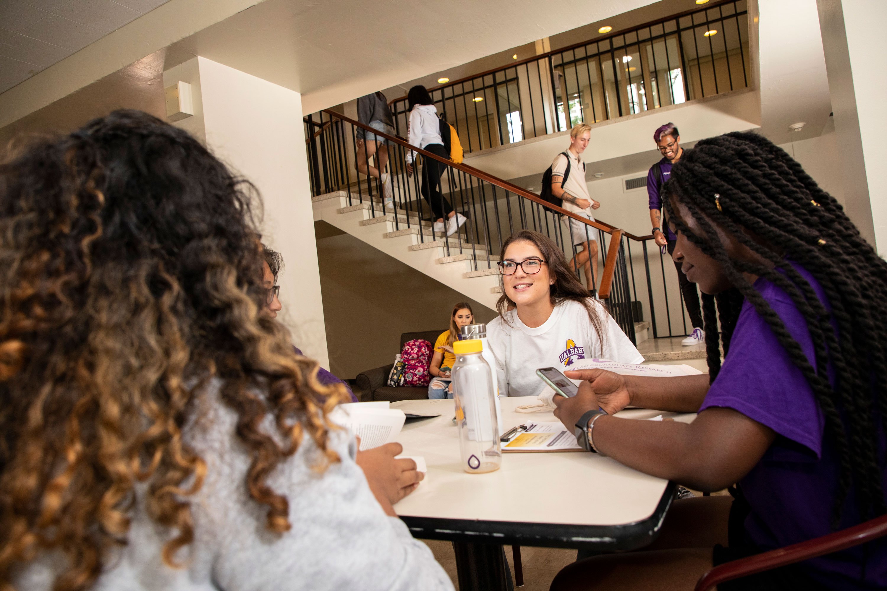 The quad offers a traditional residence hall environment, with a Resident Assistant (RA) assigned to each floor of the low-rise buildings and on every other floor of the tower. RAs live on site and serve as a resource for students.