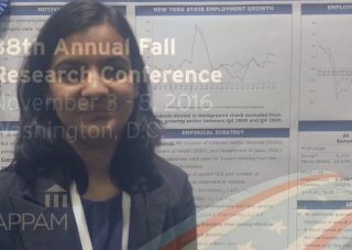 Garima Siwach wins First Place for her poster, "Unemployment Shocks for Individuals on the Margin: Exploring the Recidivism Effects," at the Association for Public Policy Analysis Fall 2016 Research Conference. (Watch her poster presentation.)