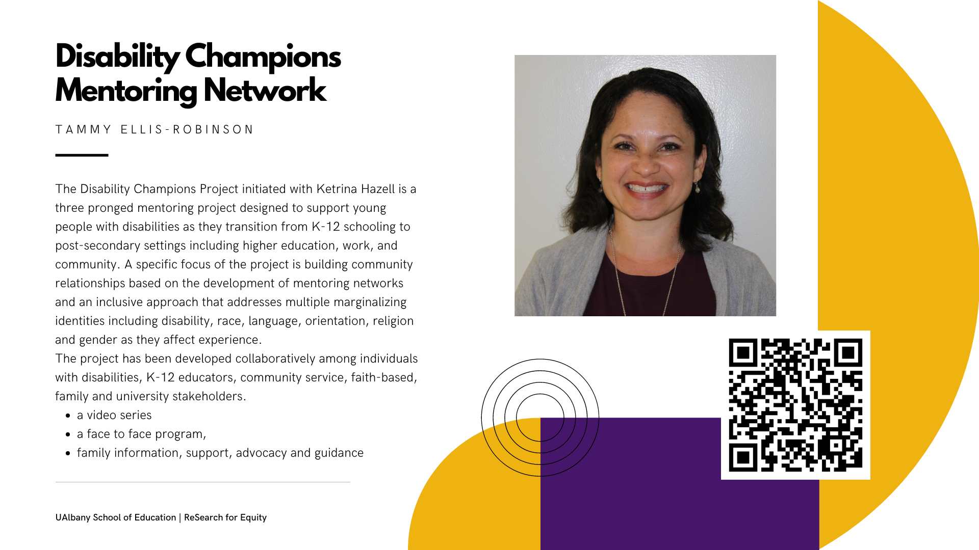 Disability Champions Mentoring NetworkTammy Ellis-Robinson - The Disability Champions Project initiated with Ketrina Hazell is a three pronged mentoring project designed to support young people with disabilities as they transition from K-12 schooling to post-secondary settings including higher education, work, and community. A specific focus of the project is building community relationships based on the development of mentoring networks and an inclusive approach that addresses multiple marginalizing identities including disability, race, language, orientation, religion and gender as they affect experience. The project has been developed collaboratively among individuals with disabilities, K-12 educators, community service, faith-based, family and university stakeholders. It includes a video series, a face to face program, and family information, support, advocacy and guidance. UAlbany School of Education ReSearch for Equity