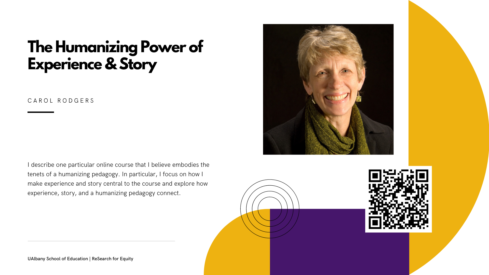 The Humanizing Power of Experience & StoryCarol Rodgers - I describe one particular online course that I believe embodies the tenets of a humanizing pedagogy. In particular, I focus on how I make experience and story central to the course and explore how experience, story, and a humanizing pedagogy connect. UAlbany School of Education ReSearch for Equity