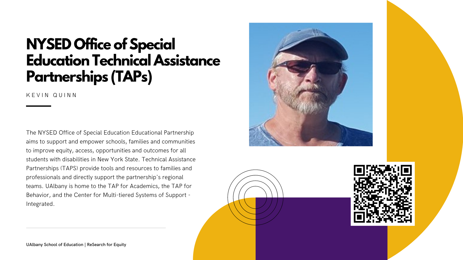 NYSED Office of Special Education Technical Assistance Partnerships (TAPs)Kevin Quinn - The NYSED Office of Special Education Educational Partnership aims to support and empower schools, families and communities to improve equity, access, opportunities and outcomes for all students with disabilities in New York State. Technical Assistance Partnerships (TAPs) provide tools and resources to families and professionals and directly support the partnership's regional teams. UAlbany is home to the TAP for Academics, the TAP for Behavior, and the Center for Multi-tiered Systems of Support - Integrated. UAlbany School of Education ReSearch for Equity