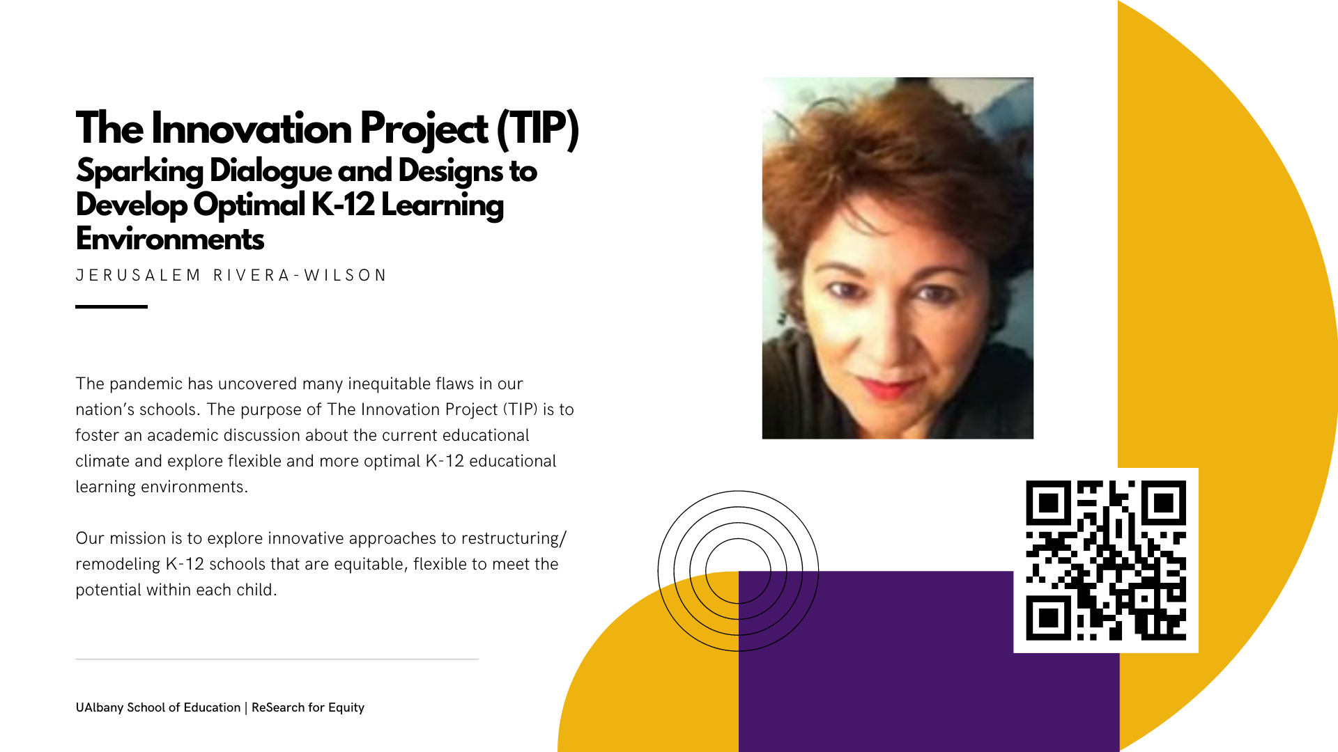 The Innovation Project (TIP): Sparking Dialogue and Designs to Develop Optimal K-12 Learning EnvironmentsJerusalem Rivera-Wilson - The pandemic has uncovered many inequitable flaws in our nation’s schools. The purpose of The Innovation Project (TIP) is to foster an academic discussion about the current educational climate and explore flexible and more optimal K-12 educational learning environments. Our mission is to explore innovative approaches to restructuring/ remodeling K-12 schools that are equitable, flexible to meet the potential within each child. UAlbany School of Education ReSearch for Equity