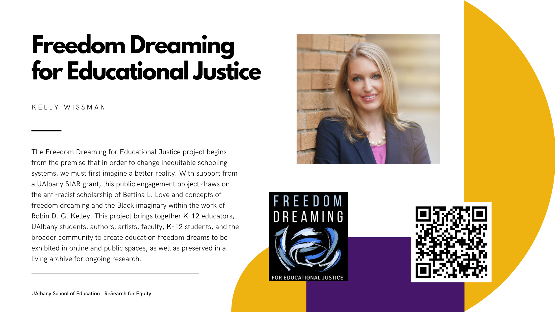 Freedom Dreaming for Educational JusticeKelly Wissman - The Freedom Dreaming for Educational Justice project begins from the premise that in order to change inequitable schooling systems, we must first imagine a better reality. With support from a UAlbany StAR grant, this public engagement project draws on the anti-racist scholarship of Bettina L. Love and concepts of freedom dreaming and the Black imaginary within the work of Robin D. G. Kelley. This project brings together K-12 educators, UAlbany students, authors, artists, faculty, K-12 students, and the broader community to create education freedom dreams to be exhibited in online and public spaces, as well as preserved in a living archive for ongoing research. UAlbany School of Education ReSearch for Equity
