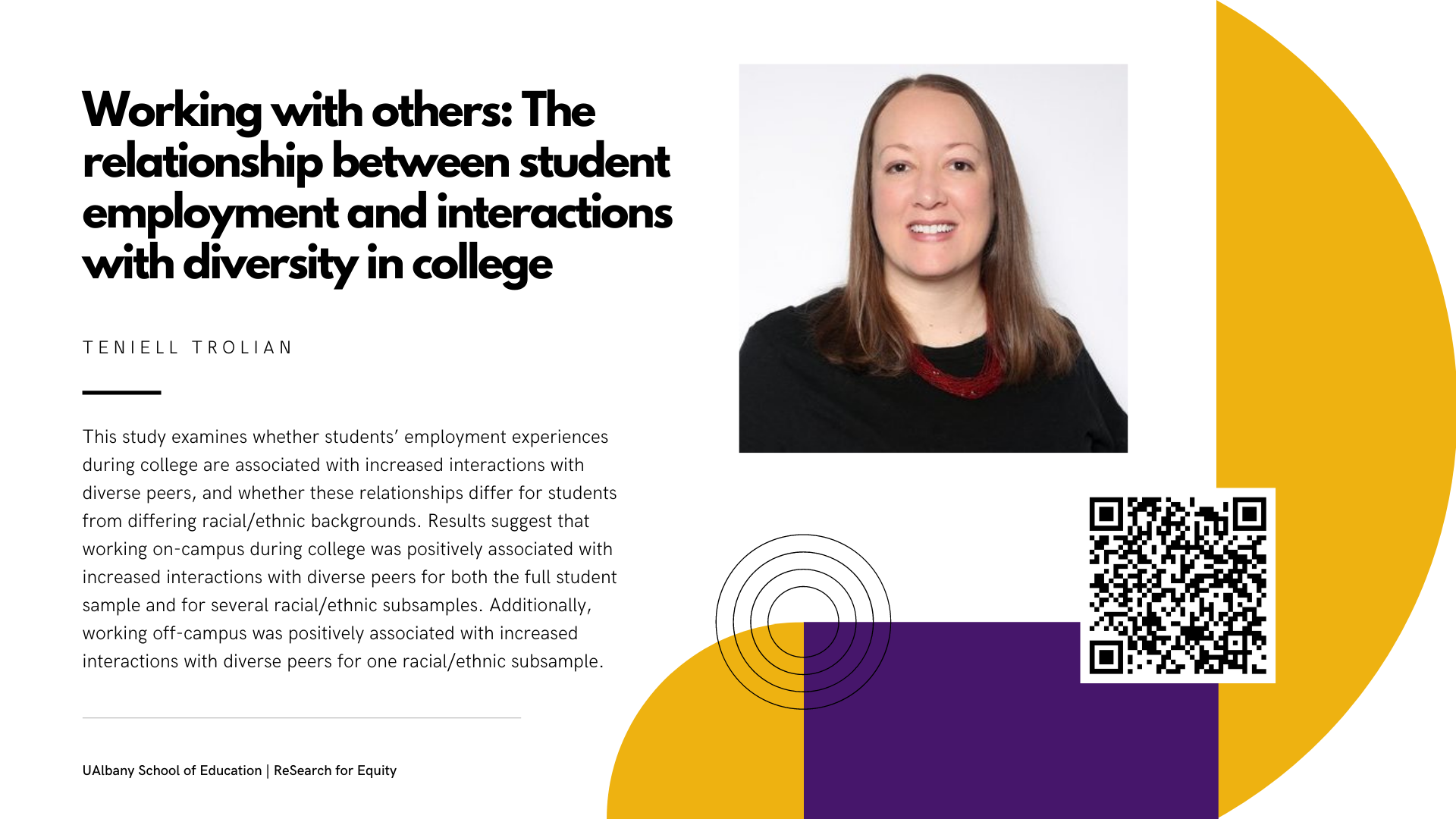 Working with others: The relationship between student employment and interactions with diversity in collegeTeniell Trolian - This study examines whether students’ employment experiences during college are associated with increased interactions with diverse peers, and whether these relationships differ for students from differing racial/ethnic backgrounds. Results suggest that working on-campus during college was positively associated with increased interactions with diverse peers for both the full student sample and for several racial/ethnic subsamples. Additionally, working off-campus was positively associated with increased interactions with diverse peers for one racial/ethnic subsample. UAlbany School of Education ReSearch for Equity