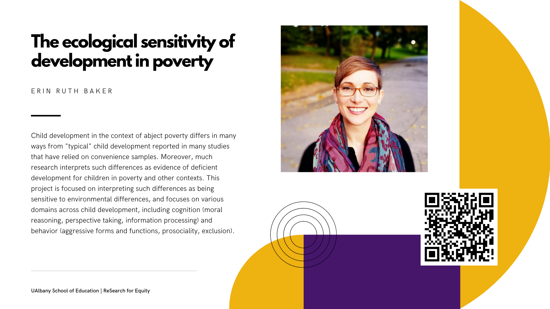 The ecological sensitivity of development in povertyErin Ruth Baker - Child development in the context of abject poverty differs in many ways from "typical" child development reported in many studies that have relied on convenience samples. Moreover, much research interprets such differences as evidence of deficient development for children in poverty and other contexts. This project is focused on interpreting such differences as being sensitive to environmental differences, and focuses on various domains across child development, including cognition (moral reasoning, perspective taking, information processing) and behavior (aggressive forms and functions, prosociality, exclusion). UAlbany School of Education ReSearch for Equity