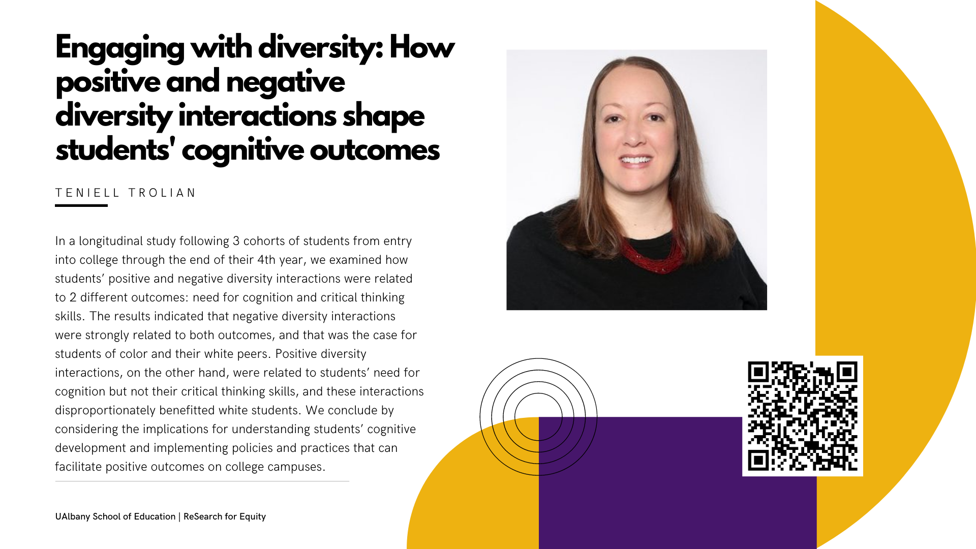 Engaging with diversity: How positive and negative diversity interactions shape students' cognitive outcomesTeniell Trolian - In a longitudinal study following 3 cohorts of students from entry into college through the end of their 4th year, we examined how students’ positive and negative diversity interactions were related to 2 different outcomes: need for cognition and critical thinking skills. The results indicated that negative diversity interactions were strongly related to both outcomes, and that was the case for students of color and their white peers. Positive diversity interactions, on the other hand, were related to students’ need for cognition but not their critical thinking skills, and these interactions disproportionately benefitted white students. We conclude by considering the implications for understanding students’ cognitive development and implementing policies and practices that can facilitate positive outcomes on college campuses. UAlbany School of Education ReSearch for Equity