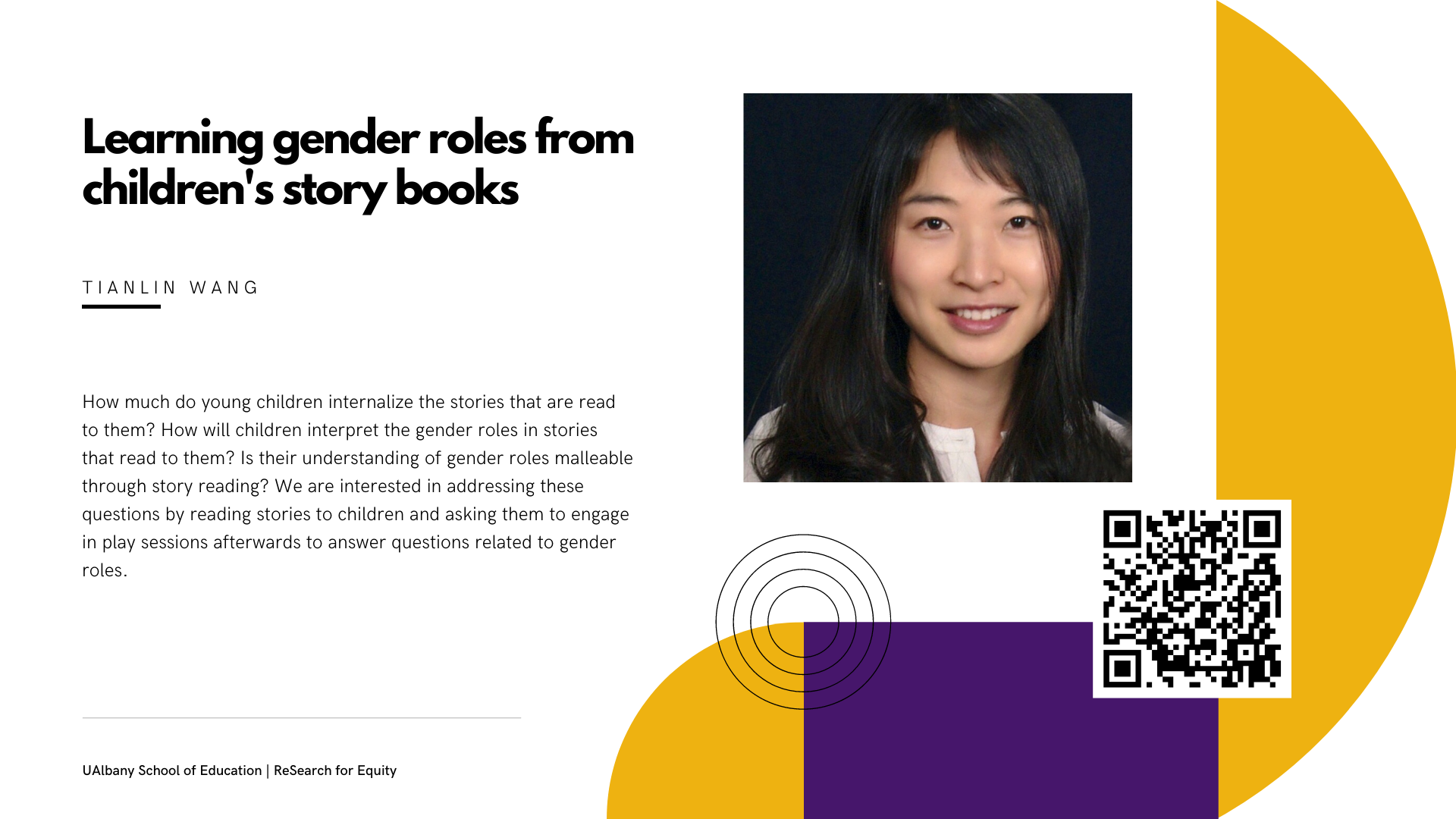 Learning gender roles from children's story booksTianlin Wang - How much do young children internalize the stories that are read to them? How will children interpret the gender roles in stories that read to them? Is their understanding of gender roles malleable through story reading? We are interested in addressing these questions by reading stories to children and asking them to engage in play sessions afterwards to answer questions related to gender roles. UAlbany School of Education ReSearch for Equity