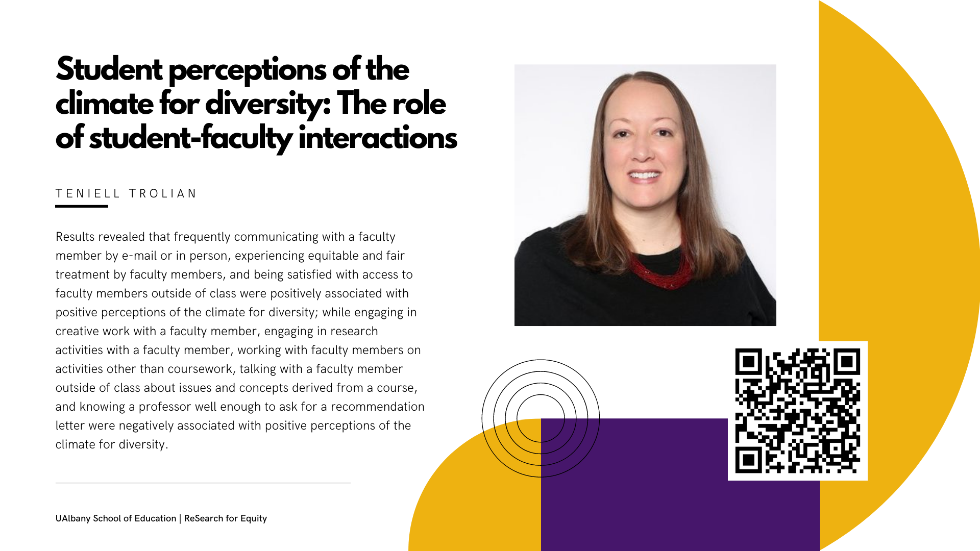Student perceptions of the climate for diversity: The role of student-faculty interactionsTeniell Trolian - Results revealed that frequently communicating with a faculty member by e-mail or in person, experiencing equitable and fair treatment by faculty members, and being satisfied with access to faculty members outside of class were positively associated with positive perceptions of the climate for diversity; while engaging in creative work with a faculty member, engaging in research activities with a faculty member, working with faculty members on activities other than coursework, talking with a faculty member outside of class about issues and concepts derived from a course, and knowing a professor well enough to ask for a recommendation letter were negatively associated with positive perceptions of the climate for diversity. UAlbany School of Education ReSearch for Equity