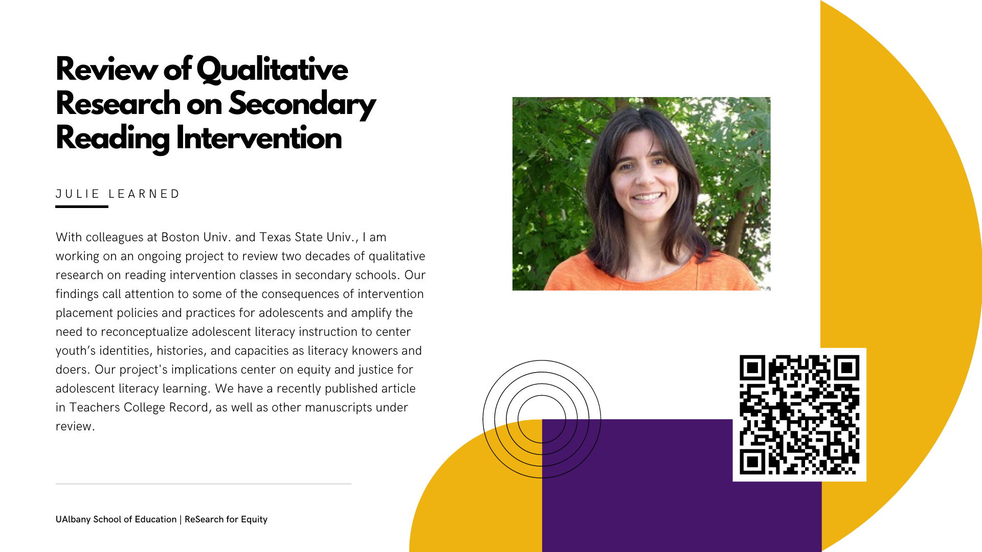 Review of Qualitative Research on Secondary Reading InterventionJulie Learned - With colleagues at Boston Univ. and Texas State Univ., I am working on an ongoing project to review two decades of qualitative research on reading intervention classes in secondary schools. Our findings call attention to some of the consequences of intervention placement policies and practices for adolescents and amplify the need to reconceptualize adolescent literacy instruction to center youth’s identities, histories, and capacities as literacy knowers and doers. Our project's implications center on equity and justice for adolescent literacy learning. We have a recently published article in Teachers College Record, as well as other manuscripts under review. UAlbany School of Education ReSearch for Equity