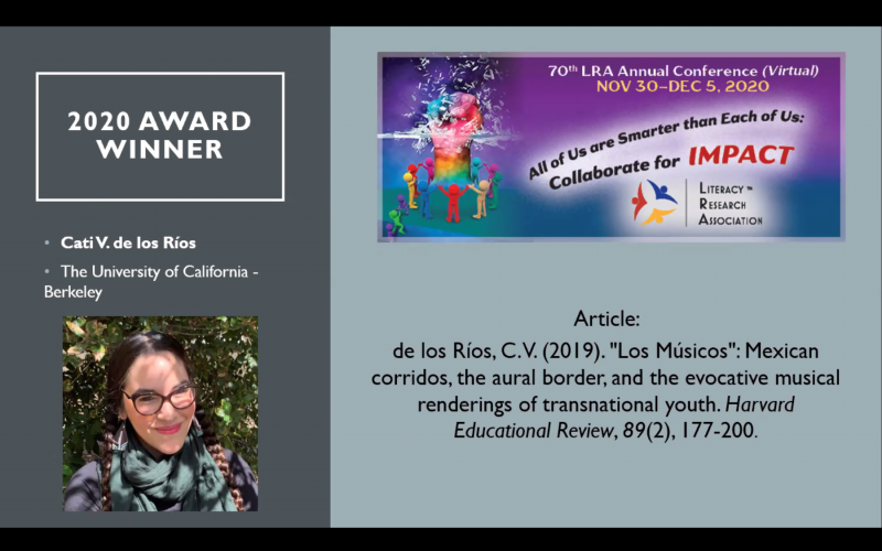 Albany, NY (December 4, 2020) – Dr. Cati V. de los Ríos of Berkeley Graduate School of Education was honored with the 2020 Arthur Applebee Award for Excellence in Research on Literacy for her article, “los Músicos”: Mexican Corridos, the Aural Border, and the Evocative Musical Renderings of Transnational Youth, published in Harvard Educational Review.