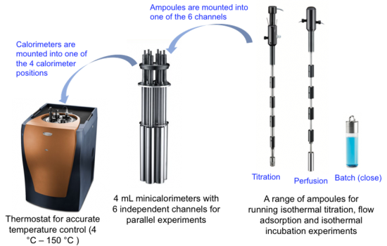 Experiment types: isothermal titration (liquid to liquid or liquid to solid suspension), perfusion (gas or liquid flow through solids), batch experiment (isothermal or temperature scanning);