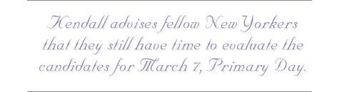 In the meantime, Kendall urges her fellow New Yorkers to prepare for Primary Day: �There�s still time to look at the candidates.�