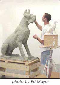 Behind the scenes of the University's move to Division I sports, a senior art student toiled away for a year, sculpting the larger-than-life Great Dane who now graces the lobby of the Recreation and Convocation Center.