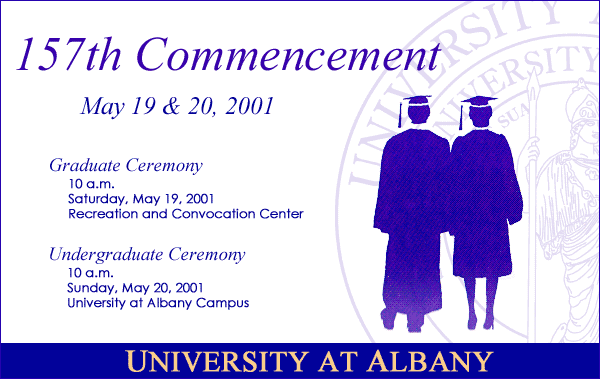 Commencement Programs, listing August and December 2000 graduates and May 2001 degree candidates who applied by the deadline, will be distributed at the commencement ceremonies. The Registrar�s Office will be happy to mail a Commencement Program upon request to those who are listed therein but who are unable to attend the May ceremonies. Requests should be made to the Registrar, Campus Center B-25, 1400 Washington Ave., Albany, NY 12222, ATTN: Commencement Program.