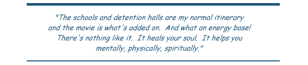 From the very first, Olmos believed strongly that he had a responsibility to "give back" to his community, and to the world. He maintains that, far from getting in the way of his career, his work with youth at risk actually fed his acting. "They are an extraordinary source of energy that I would not have otherwise," he says. "After an hour of speaking with those youth, I walk away with a buzzing feeling inside. Because, you're one person giving to more than three hundred people who are giving back to you. I learned that the first time I gave a talk. After I finished that day, I had to perform that night in a play. It was one of the best performances I had ever given."