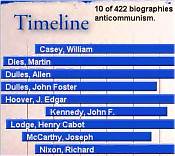 There is also a primitive timeline that superimposes, by pre-selected category through a bar graph, the life spans of subjects against a background of historical milestones. The timeline is of limited value for two reasons. First, the graph displays the subject's entire life, not the period that addresses the topic searched. Thus Richard Nixon is an "anticommunist" for much of the 20th-century, right-wing criticism of him for d�tente in the 1970s notwithstanding. Second, the "milestones" against which the topics displayed are measured are the same, regardless of topic. The one closest to Nixon's historic opening to the People's Republic of China is the Apollo 11 moon landing.