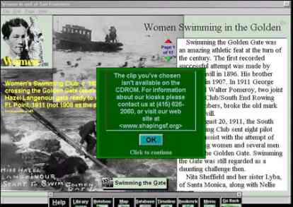 The reader may go "Back" to the top level of "Gay/Lesbian," or "Wander," which always takes you though all of the screens in this thematic cluster or the chosen tour, in the same order. Unfortunately, the tyranny of "the screen" in Shaping San Francisco extends beyond the technical limitations of the authoring tool and its rather annoying layout rigidities. It becomes a serious epistemological threat to the whole project and its intent to provide interaction "between people," supply a "living history" of the city, or empower its users and the underprivileged social groups. A great deal of the problems in Shaping San Francisco are related to a profound misunderstanding of the concept of "interactivity" and its true potentials and to the inherent lack of freedom of the user to recombine the various elements of knowledge, supplied on the disk: clips, excerpts, documents, and narratives. In the roll-out speech on January 22, 1998, published on the web site, Chris Carlsson ambitiously declared the difference between this interactive product and other multimedia texts: Shaping San Francisco is different than previous efforts in multimedia in a number of ways. First it is designed to promote interactivity between humans rather than between a person and a box. Much of the hype around this new media form focuses on the buzzword 'interactivity.' Interactive multimedia is really an elaborate, technologically sophisticated form of multiple choice, nothing more. Shaping San Francisco is a bunch of linked computer files that are designed to reinforce creative responses to our daily lives today. (Introducing Shaping San Francisco, Chris Carlsson's rollout speech on Jan. 22, 1998, published on the Shaping San Francisco web site: http://www.shapingsf.org.) Ironically, Carlsson grossly underestimates the actual possibilities of digital interactivity. Pre-set multiple-choice links do indeed falsely masquerade as "interactivity," but an intelligent relational database can link and recombine various records and record-sets in an infinite way, giving the user a real "participatory freedom"of research and exploration. It is possible that the makers of Shaping San Francisco, not understanding this, mistakenly felt themselves limited to the faux representation of interactivity (being simply a technology of "multiple choice" out of "a bunch of linked computer files"). For whatever reason, Shaping San Francisco reproduces the undemocratic (forced-choice) structure that Carlsson rightly criticized in his roll-out speech. The makers' misunderstanding, then, may have led to the unfortunate choices of making the smallest structurally indivisible unit the "screen" or "the page." "The screen," pre-designed and pre-linked by the authors to a few other screens is not and should not be the structural unit of knowledge in a public historical endeavor such as Shaping San Francisco. In fact, it limits interaction precisely to an interaction to one "between a person and a box." Think now of the very basic examples the "interactivity" of a telephone or of the game of tic-tac-toe, versus the interactivity of a pre-programmed ATM machine. When it comes to chess, most of us prefer to play the game by the infinite possible variations in moves, rather than to be led through a very limited number of screens with game positions which the authors had once played and which are arranged in thematic "sections" or "tours," marked in the upper-left corner of the board. Shaping San Francisco provides only one visual and thematic context for each of its documents, narratives and other blocks of knowledge, included on the CD. This may be why the library and the database are the weakest tools for exploring the contents of the CD-ROM. They seem like artificial add-ons to the "bunch of linked computer files" (indeed, the database is a still-unfinished feature) rather than parts of a carefully planned and expandable data structure. Furthermore, the authors claim that: Shaping San Francisco is designed to create a new kind of public space around our shared histories. It is not the last word on local history, but the first edition of a media experiment in which we can tell each other how things were, what shaped our lives, what was tried and what worked and what didn't? Ideally, Shaping San Francisco will grow and publish future editions. If Shaping San Francisco is widely used it can reach its goal of becoming a living archive of San Francisco. [http://www.shapingsf.org/rollout.htmlweb site.] It is not clear, however, how at present, Shaping San Francisco can transcend the limits of a singular effort of a limited number of authors trying to reach an audience of consumers and users with several uniformly styled slide-shows on a disk. The bridge between "participatory" history and "authored" history cannot be crossed if we only predict what could happen with future editions or because we put the "history" on a CD-ROM, rather than a book. Even if we build the biggest number (or "community") of pre-programmed ATM machines, each only giving us the freedom to choose between "withdrawal" and "deposit" screens, we would not become "interactive" participants in a financial community nor would we be empowered to become bankers. We are far from maintaining that "the medium" here is the whole "message." Ironically, however, both the medium and the central design metaphors are shaping Shaping San Francisco into a ready-made "edutainment" audio-visual product of its own, which functions in a direction contrary to the project's central purpose. The authors themselves often feel the need to justify their fixed design paradigm and alleviate this contradiction. One of these approaches is, of course, to stress the "extra-textual" efforts to set-up the public practice of exhibition of this product (kiosks, library tours, a web-site version, which could create and links to "real" communities and discussion forums). However, as we have said, these efforts are epistemolo