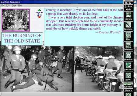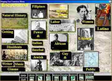 This is no small feat, since San Francisco is a major city with a complex past and present. In several sessions ranging from 30 minutes to 2 hours, we (separately and together) managed to visit and read nearly all of the screens. These range from short biographical sketches of scores of historical figuresmany of them not typical City Father typesto very useful overviews of major historical events. These events range from the 1934 General Strike led by Harry Bridges and the long shore workers, to the white Night Riot of 1979, protesting the manslaughter verdict of Dan White, confessed killer of Mayor George Moscone and gay Supervisor Harvey Milk. Readers can access these materials via several search metaphors: the Encyclozine, which organize the screens according to their main topic, a "Library" in which each subject or locale is represented as the spine of a book; a