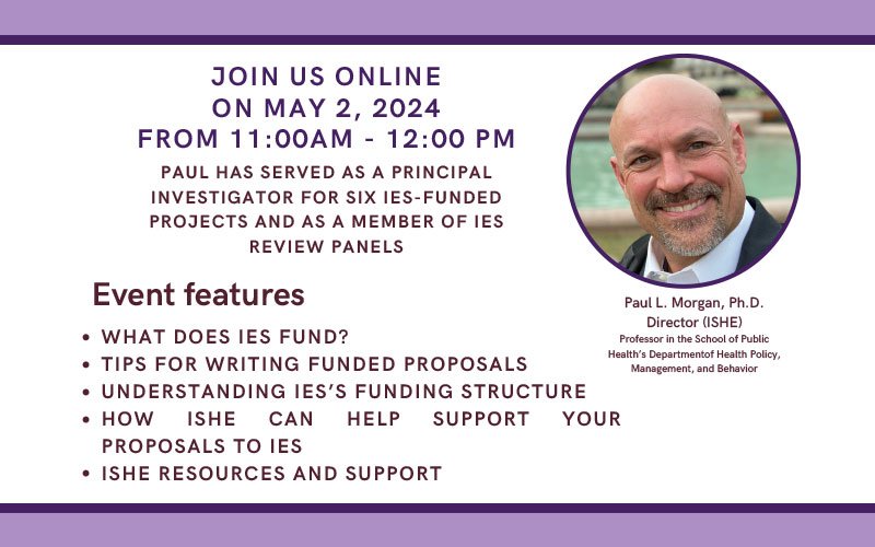 ISHE Director Paul L. Morgan, PhD has served as a principal investigator for six IES-funded projects and as a member of IES review panels.