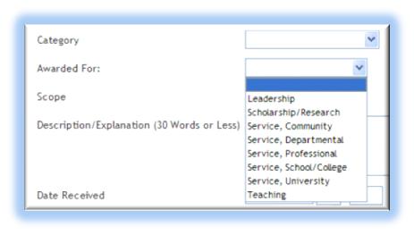 The menus for "Scope" in the previous screens included the choices International, National, Regional, State, and Local. This menu still has those choices but also includes choices to indicate if the award or honors "Scope" was "University" or "School/College" or "Department."