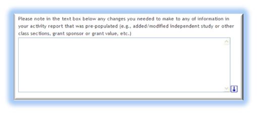 At the bottom of each Scheduled Teaching form are three optional text boxes: Describe any pedagogical innovations, describe any new teaching material, and describe any activities that enhanced learning. The department or college may or may not use this information. Each box may be enlarged by using the mouse to drag the bottom right corner.