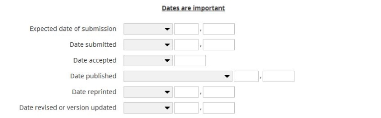 For some categories, such as Publications, there are a series of dates for submission, acceptance, publication, and reprints. These dates are relevant to publication reports. Over time a record can be updated with new dates as they occur.
