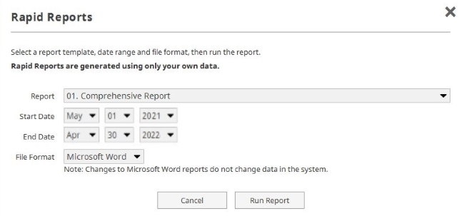 Select Rapid Reports to generate a report of the complete range of activity data or select sections.