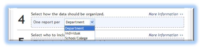 Although the dropdown menu suggests you can generate reports for another individual or a whole department, college or school, individual users effectively only have one option, as even if you choose "Department" or "School/College" an individual faculty member only has access to information concerning him or herself. The department chair could select her or his department (but no other department) or could select one or more, or all individual faculty, but only from his/her department. Similarly, the dean of a school or college could select the entire school or college or have the results organized by department or by faculty in that school or college (all of them or selected individuals, which brings us to Step 5.)