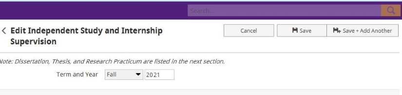 Each dissertation, thesis, or research practicum is reported in its own form. They must be added by faculty because they may span multiple terms and loading them from the Registrar's records creates duplicated. Start and end dates are crucial.