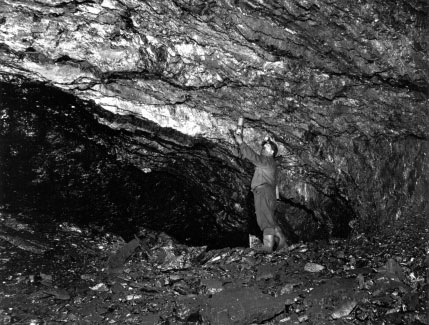 Fireboss, John Haughton, checking for gas at face of coal, 6th level, No. 8 colliery