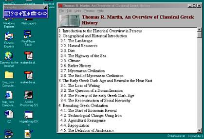 The Historical Overview has been specially written for Perseus by Thomas R. Martin. The text, which might function as an extremely handy resource for an introductory Greek history class for undergraduates, covers the standard span from the end of the Mycenean period down to the death of Alexander. Attention is devoted to social history, with sections on housing, slavery, the position of women, religion, as well as the standard political and military history, which is adequately covered for the purposes of an introductory undergraduate course. Nonetheless, I felt the need for more detail in some places, for example the reforms of Cleisthenes: just how he seems to have attempted to break up areas under the control of one clan by grouping demes from different and sometimes widely separated regions of Attica together into artificially created tribes is not explained.