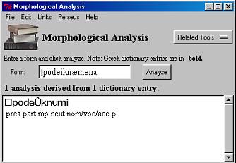 | Perseus offers more than just a collection of these texts; it also provides a whole box of Philological Tools to search and analyze them. The authors can be searched individually (a search of all authors together does not seem possible) for occurrences of words (in Greek) either singly or in combination with another word. The frequency of a particular word can also be calculated. But what sets Perseus apart from other search programs I am familiar with is the morphological analysis tool: a user can select an unfamiliar word in a Greek text, click on the Analyze button, and will be told what part of speech it is and in the case of a verb, for example, what the first principal part is and what mood, tense, voice and person it could be. I say "could be" because the morphological analysis tool can only present you with possibilities: it can tell you that a given verbal form could be first person sing. future indicative active or first person sing. aorist subjunctive active, but cannot tell you which of these alternatives is correct in the context. Fair enough. I have however noticed some mistaken analyses: at line 466 of [Aeschylus] Prometheus Bound the noun khlid�s yields the following two analyses: pres. ind. act. 2nd sg. of the verb khlidaô (impossibleno such form of this verb is attested as far as I can find in the TLG) and fem. gen. sg. of the noun khlidê (correct). The Latin morphological tool on the Web site also suffers from a mistake: at Catullus 1.3, Corneli is analyzed as "masc./neut. gen. sg." of Corneliusperfectly possible of course (though not in this context), but the correct analysis, viz. vocative sing., is nowhere to be found. Other vocative forms in -i are similarly incorrectly analyzed in the text of Horace's Odes. Teachers of Greek (those that have heard of Perseus!) are divided on whether to share their knowledge of the existence of the morphological analysis feature with their students or not. Some object to it because it may encourage students to become overly passive and reliant on the (not always correct) analyses of others instead of actively attempting by themselves to analyze forms and so consolidate their grammatical knowledge and improve their reading skills. Others will reply that any tool that eases the student's path in those situations where he or she simply cannot work out a form should be made freely available to them and that only a small number will abuse it. Perseus provides another textual tool, which is less problematic and extremely handy: by pulling down the Related Tools menu one can look the word up in an electronic version of Liddell and Scott's Intermediate Greek-English Lexicon (the Web site offers the ninth edition of the larger Greek-English lexicon, with direct links to passages mentioned in entries).