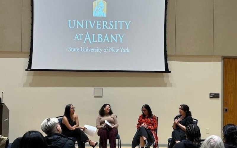 More than 100 people attended a conversation with Latina authors Angie Cruz (far right) and Lilliam Rivera (second from right) in the Campus Center Tuesday night 10/8/24. The novelists were interviewed by UAlbany students Arely González Hernández (far left) and Bianca Zazzarini-Leon (second from left) for an event in celebration of Hispanic Heritage Month and co-sponsored by UAlbany’s Black, Indigenous, Latinx and People of Color Faculty Advancement Initiative; Department of Languages, Literatures and Cultures; CHATS Humanities Labs; Department of Africana, Latin American, Caribbean and Latinx Studies; Center for the Elimination of Minority Health Disparities; UAlbany Libraries; Office of Diversity and Inclusion; and the NYS Writers Institute. (from Today at UAlbany)