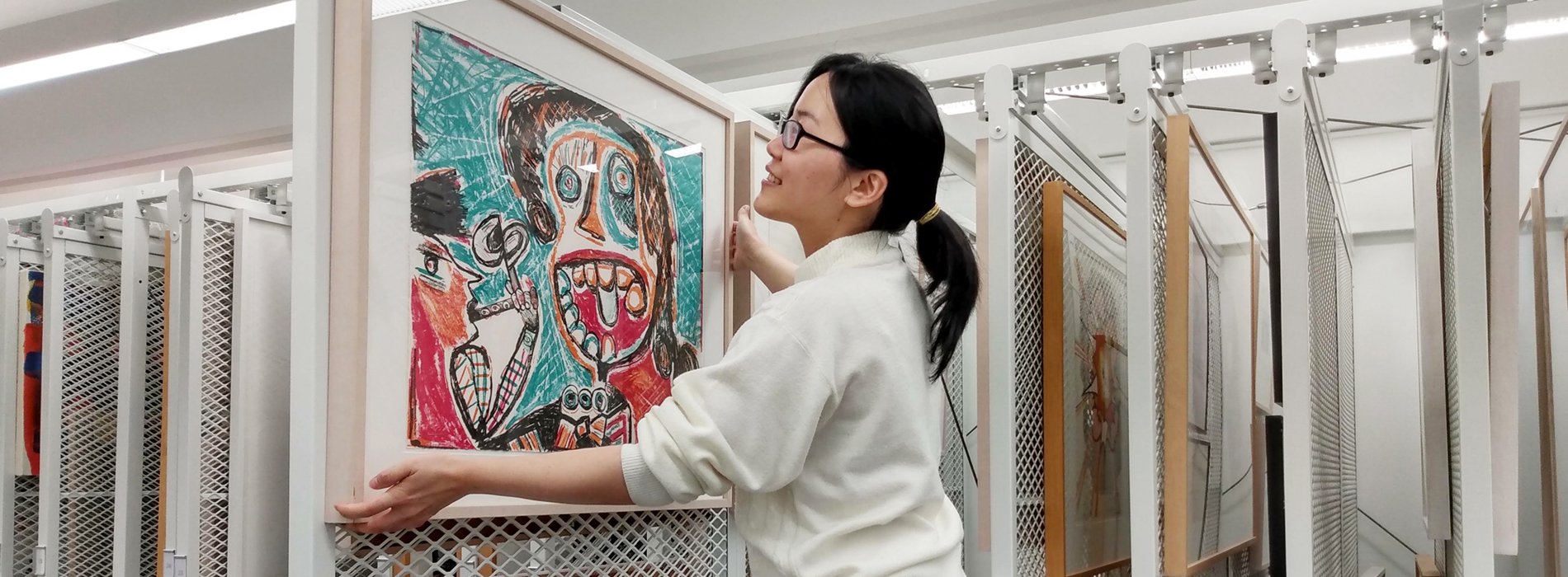 Tzuyun Wei, Department of Art and Art History graduate student intern, is the first participant to make the selection on view from February 4 through February 20. Talking about the works by artists Raphael Collazo (1943-1990, Puerto Rican) and George McNeil (1908-1995, American) she says, “Their vision is a conversion of the real into the imaginary. This abstract and expressionist work brings together both conscious and subconscious subjects. These sentimental compositions make my heart full of desire to paint when I look at them.”