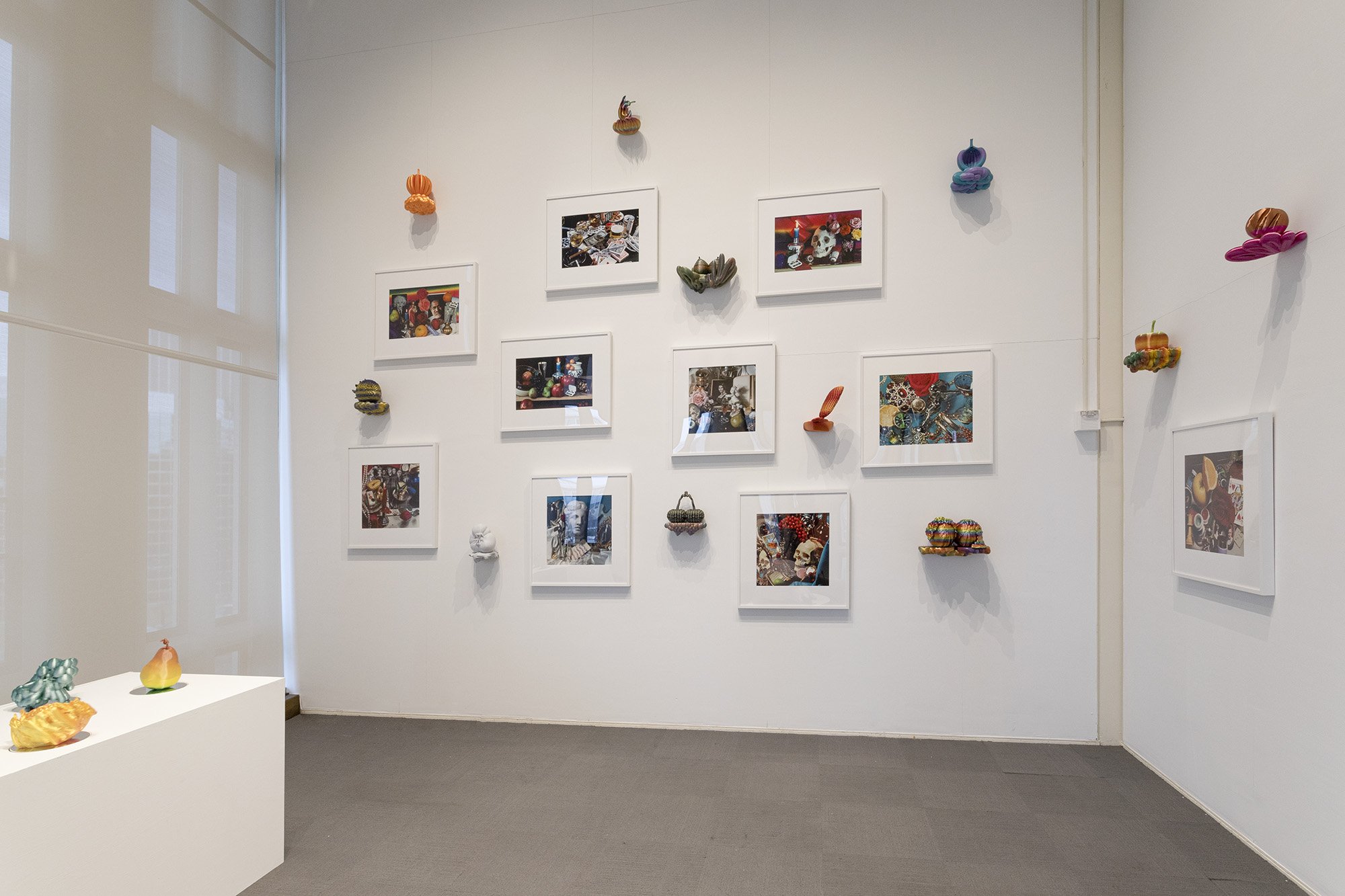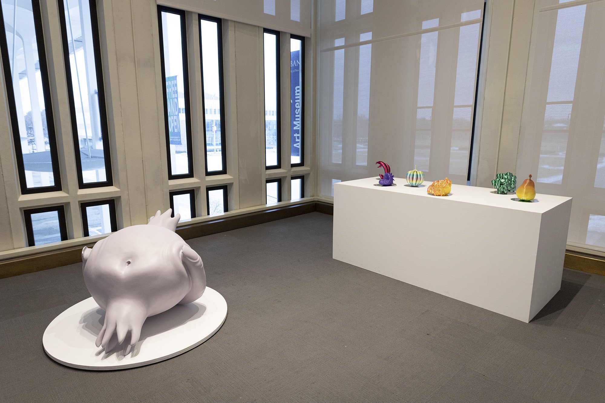 Photographs from the University at Albany Fine Art Collections by Photorealist painter Audrey Flack and recent 3D printed sculptures by artist Gracelee Lawrence share unexpected commonalities in the Collections Study Gallery. Using an intricate three-layer (cyan, magenta, yellow) dye-transfer process, Flack’s photographs explore color saturation and also function as sources for her groundbreaking vanitas still lifes from the 1970s and early 1980s. Printed in multi-colored, reflective filaments, Lawrence’s objects—which begin as 3D scans of bodies and fruit—exist in a transfigurative space between physical and digital reality. Paired together, Flack’s and Lawrence’s works provide meditations on time and subjectivity, mechanical and digital reproduction, and capitalist consumption in our contemporary world.